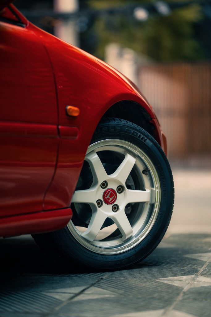 The original Milano Red gave way to Porsche Carmine Red, a subtle but richer shade that suits the Civic’s lines beautifully. A set of white alloy wheels was added, wrapped in fresh tyres — a nod to the JDM influence that defined so much of this car’s earlier life. The suspension was lowered by 20mm on coilovers, transforming both the stance and the way the car handles without sacrificing its character.
