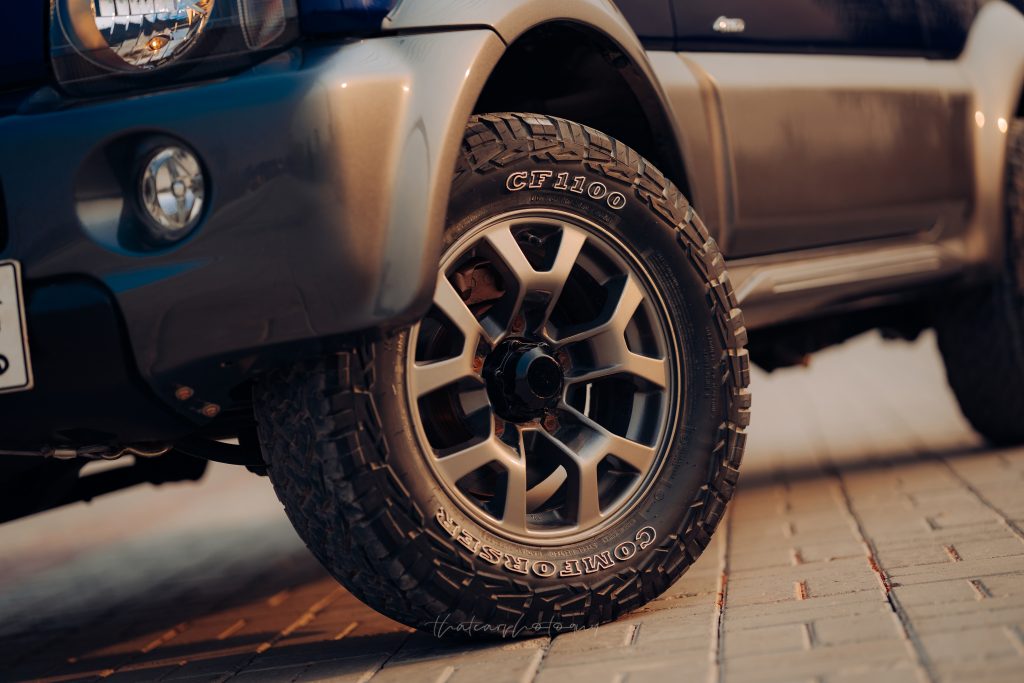 - Wheels and tyres from the latest-generation Jimny — sourced from a friend who upgraded their new car — gave it a wider stance and a more purposeful posture.